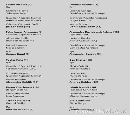 北京時間昨晚,本賽季最后一站ATP1000大師系列賽--巴黎站公布了男單正賽簽表。世界前八中,除了此前宣布退賽的塞爾維亞球王德約科維奇,其他人都悉數出戰。世界第一阿爾卡拉斯與美國一哥弗里茨領銜上半區,世界第二辛納和德國一哥小茲維列夫鎮守下半區。前八大種子的對位:阿爾卡拉斯--魯德、弗里茨--德米納爾、穆塞蒂--茲維列夫、謝爾頓--辛納。保加利亞帥哥迪米特洛夫傷愈復出,首輪將對陣法國大炮佩里卡德。